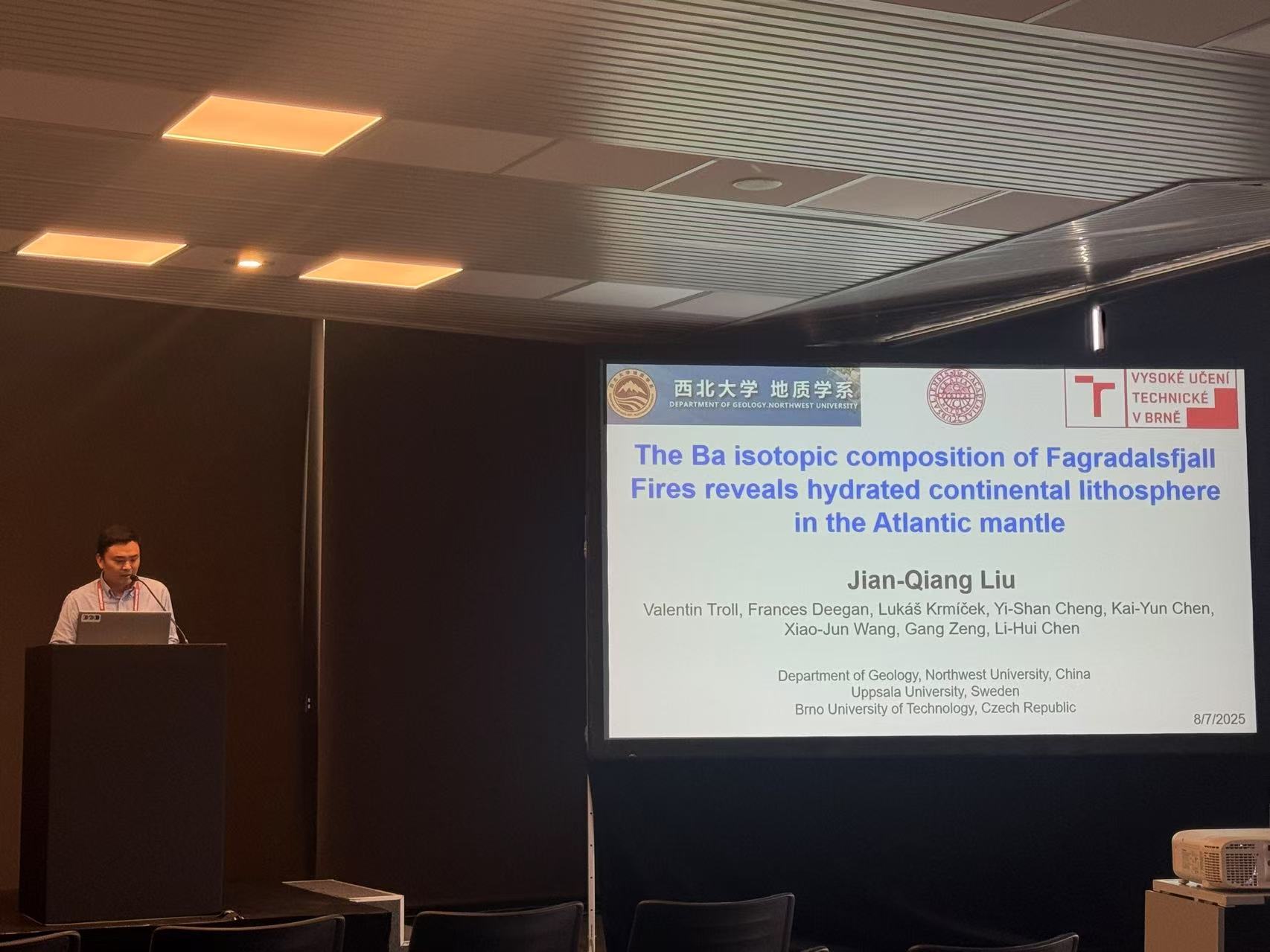 图2:王小均副教授在2025年戈尔德斯密特会议上做口头报告 7月8日下午刘建强副教授在04f-O1专题上做了题为“The Ba isotopic composition of Fagradalsfjall Fires reveals fluid-modified lithospheric mantle beneath the mid-Atlantic ridge”的口头报告,展示了运用Ba同位素示踪冰岛玄武岩地幔源区物质组成的工作(图3)。
