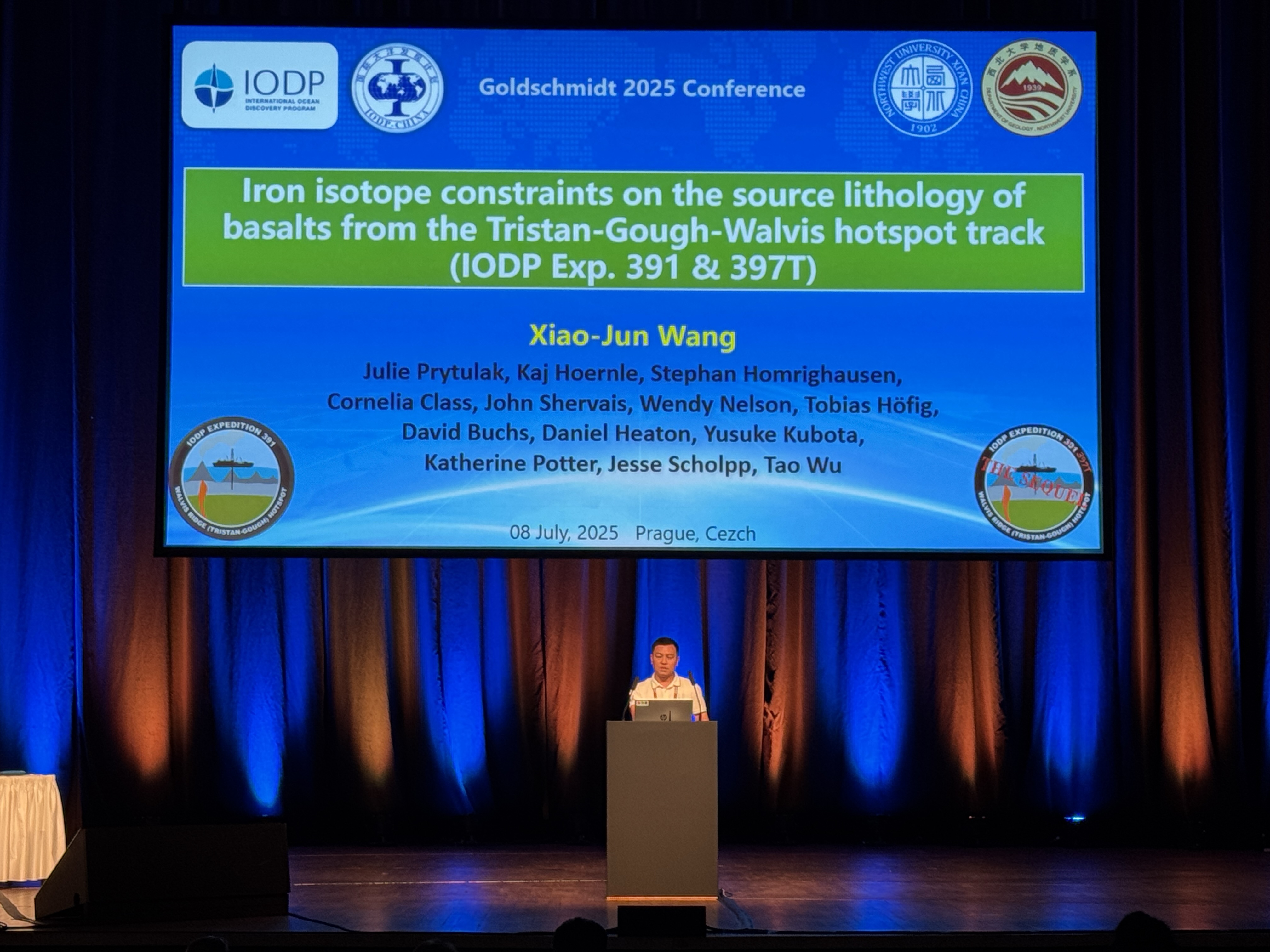 图1:成倚山博士生在2025年戈尔德斯密特会议上做壁报展讲 7月8日上午王小均副教授在02l-O1专题上做了题为“Iron–zinc isotopic constraints on the source lithology of basalts from the Tristan-Gough-Walvis hotspot track (IODP Expeditions 391 and 397T)”的口头报告,展示了国际大洋发现计划391和397T航次钻孔玄武岩样品的研究进展,主要介绍了运用Fe同位素探讨Tristan-Gough地幔柱岩性组成及其变化规律的工作(图2)。